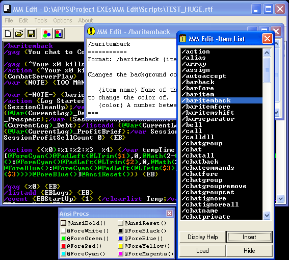 Mud Master Script Editor![]() MM Edit is a little app for writing scripts for Mud Master. MM Edit is in Beta and is yet unfinished and definitely not free of bugs. If you choose to use MM Edit, you do so willingly and you accept all risks and damages that may occur from using this application. NOTE: MM Edit is basically "finished". Although I may continue to post updates, I no longer plan to work on it to any great extent. Some of the features in MM Edit: Colored Text MM Edit will color, on the fly (as you type), particular strings to help visually denote key parts of your script. The colors can be defined so you can choose whatever color setup you like. Colorize Existing Scripts You can add color to an existing script file that wasn't written with MM Edit. Script Compiler You can write scripts in "code" style, then compile them. Command|Procedure|Other - insertion/help You can edit and add/remove/modify items that are placed in a list. Then insert these items into your script, and/or call up help about each item that is in the list. Asc/Chr Tool A simple tool to show you the Ascii value of a given character, or show the character of a given Ascii value. Ansi Proc inserter Tired of endlessly typing ansi proc strings into your display showmes? Just click a button to insert them. Bracer Matching Find matching (or missing) bracers. Bookmark Tired of scrolling around a big script, only to lose where you were last editing? Simply set a bookmark to easily return to where you left off. Beta Release If you'd like to fiddle around with MM Edit then feel free to do so. It is in "Beta", and is yet unfinished. To install just unzip it and put it in some directory somewhere and run it. (Please READ the Install doc, and I recommend looking at the Changes doc) If you want to save a colorized file, save it as an *.RTF file. If you want to use it as a script file, save it as plain text (removes all rtf info). Main Application: Latest version: v1.1.5 - 23 Oct 04 Download the Beta ~97k MM Edit Manual v1.3 - ~177k Download the manual The manual is in html format, and uses (very basic) java scripts (for hyperlink styles). Unzip this where ever you'd like. It will create two subdirectories with additional htm pages and images. In the root directory will be a file called "MM Edit Manual.htm". Open up that file with your web browser, should be a no-brainer after that. Please post comments/suggestions/problems on the Mud Master forum, in the MM Console Board. Missing the OCX File(s)? Get um here (650k zip). Files included are: comdlg32.ocx, mscomctl.ocx, and richtx32.ocx Just toss them into your Windows/System (or /system32) dir. I've updated the ocx files. They're all the latest versions, as far as I'm aware (modified 5/22/2000). You might check your's to see if they're as current as these. Getting this error: Component MSCOMCTL.OCX or one of its dependencies not currently registered ...? This is sort of common, and thanks to Trikal for putting up with me as I tried to get him/her up and running.. Anyway do these steps to fix the problem (problem is, the file isn't registered with your system). 1. Make sure that the file MSCOMCTL.OCX is in your Windows\System directory. 2. Click the Start button. 3. Click "Run". 4. Type in: REGSVR32 \windows\system\MSCOMCTL.OCX (if using the system32 dir, replace "system" with "system32") 5. Click Ok. Try running MM Edit after that! MM Edit Source I've release the source, under the BSD license. Agree to that, and download/edit away! License: Copyright (c) 1998-2008, J. Gordon Pine All rights reserved. Redistribution and use in source and binary forms, with or without modification, are permitted provided that the following conditions are met: * Redistributions of source code must retain the above copyright notice, this list of conditions and the following disclaimer. * Redistributions in binary form must reproduce the above copyright notice, this list of conditions and the following disclaimer in the documentation and/or other materials provided with the distribution. * Neither the name of the THIS SOFTWARE IS PROVIDED BY THE COPYRIGHT HOLDERS AND CONTRIBUTORS "AS IS" AND ANY EXPRESS OR IMPLIED WARRANTIES, INCLUDING, BUT NOT LIMITED TO, THE IMPLIED WARRANTIES OF MERCHANTABILITY AND FITNESS FOR A PARTICULAR PURPOSE ARE DISCLAIMED. IN NO EVENT SHALL THE COPYRIGHT OWNER OR CONTRIBUTORS BE LIABLE FOR ANY DIRECT, INDIRECT, INCIDENTAL, SPECIAL, EXEMPLARY, OR CONSEQUENTIAL DAMAGES (INCLUDING, BUT NOT LIMITED TO, PROCUREMENT OF SUBSTITUTE GOODS OR SERVICES; LOSS OF USE, DATA, OR PROFITS; OR BUSINESS INTERRUPTION) HOWEVER CAUSED AND ON ANY THEORY OF LIABILITY, WHETHER IN CONTRACT, STRICT LIABILITY, OR TORT (INCLUDING NEGLIGENCE OR OTHERWISE) ARISING IN ANY WAY OUT OF THE USE OF THIS SOFTWARE, EVEN IF ADVISED OF THE POSSIBILITY OF SUCH DAMAGE. Download Source (73k) By the way, MM Edit was written in VB6. |