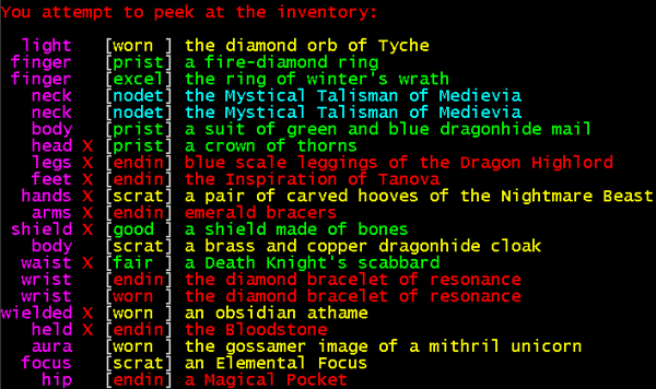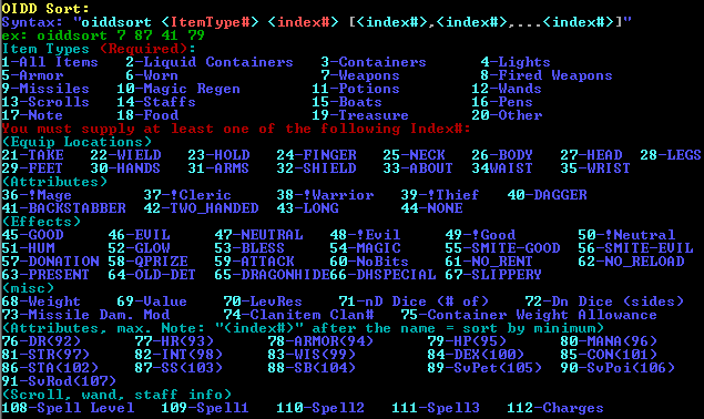 ![]() OmaEQ will help reduce the massive spew seen when doing "eq" or looking at others. It should maintain the correct color of each field. Some stuff compacted, some stuff removed (like "(invisible)" flags and any "..glows with a snore" junk). It's not very resource hogging, only 1 action is active until you actually look at an inventory. Simply load up the script and look look look! |