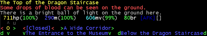 normal "Obvious Exit:..." spew. Changed: Closed exit room name pointers now match the compass color. Click the boxes to see a couple of screen shots: [x1] <-click-> [x2] |