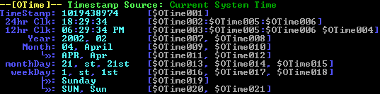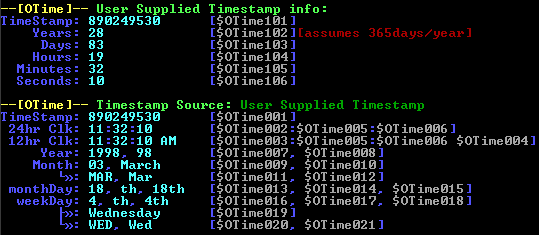 OTime is a little script that will var various time info off timestamps. The basic routine is just "otime" and it will check your current system time and make various results. Below is an image of running "otime" ![]() Items in Cyan color are the var's value, to the right of those, in the blue brackets, you'll see the var name(s) in grey. Just use those vars whereever you want to add the info into your scripts. Another way to call the script is by supplying a value, via "otime #" where "#" is some numerical string (timestamp) you want to check. You'll get an additional display. Image below: ![]() The this breaks the string you supplied into logical procession, Years/Days/Hours/Minutes/Seconds. From the image example you'll see that the timestamp of 890249530 seconds is really 28years, 83days, 19hours, 32minutes, and 10 seconds. I assume a "year" is 365 days, so inaccuracies for leap-years exist if you're trying to actually figure out a specific date. After that display, you see the "normal" information, which takes the timestamp you provided and figures out what date/time it was according to your internal computer clock. This should be pretty accurate for reviewing old time stamps you might have stored to see what they actually meant. "otime" - check current system time only "otime #" - check a user supplied value "otime ?" or "otime help" - help "otimequiet" - toggle automatic displays from showing or not showing. Read the script, some info in it up top, as well the default vars have basic info about what each var is. How's this used by you? [xx]--Click here for more info. |