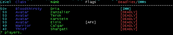 This'll help clean up the very messy "who" list spew on Realms of Despair. Pretty basic script (working off a terrible mess from the mud). Calls are: "whox <normal perameters used for who calls>" eg: "whox all" or "who 5 20" or "who cleric" Here's two screen shots of the before spew, and the after spew. [xx]<-Click ..Before [xx]<-Click ..After Note, the after shot is a different who listing, did a "whox deadly". Re-Written I totally re-wrote the script, goodgoddamn those titles in the display f'n BLOW. Those imms need to get coding and filter that crap out. It's a freaking WHO list. Some people have TWO f'n FULL lines of spew. I just want to know WHO's on, levels, important flags. Fuck the titles, I can see that crap with my eyes while walking around town. TWO FREAKING LINES. Does some friggin d00dz mentality drive them to display this crap, or what?. Mud still rocks, but my god that is some crap ass fucking code. Was still a major pain to script been on it for 7 hours :p, and it errors out because of all the f'n spew it has to filter. I suggest setting your pager to 10-12, or doing small who calls. "whox 50 50" will definitely get some errors as MM tries to parse all this shit if you don't set up the pager. I'm on a 1.2Ghz/512mb ram, DSL box and I couldn't make it reliably parse, unless I used pager of 12. Still, for short who listings it does pretty good. Again, this script is for Realms of Despair .. although probably would work on other muds using the same crap ass coded who functions. :p If I can script a cleaner who list goodgod I'd hope someone can code one! |
