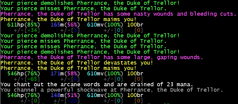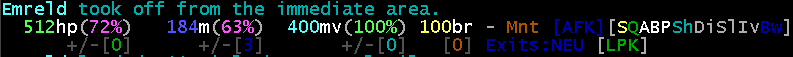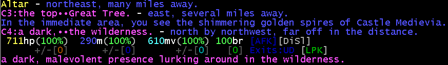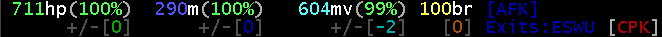 download it, right click the link and Save As... Added: "ps" alias, it'll toggle the script on/off. Just type "ps". It'll load up OFF, so type in "ps" to start it. Added: Exit info and Zone type flag (L/N/Cpk). [X] Click bracers to see a small gif of the new changes. Note: I suggest disabling group messages in MM.. "/message EnableGroup", and using Compact on the mud ("compact" so it's on). Fixed: Now works during group combat. Click the Screen Shot link for a look. |